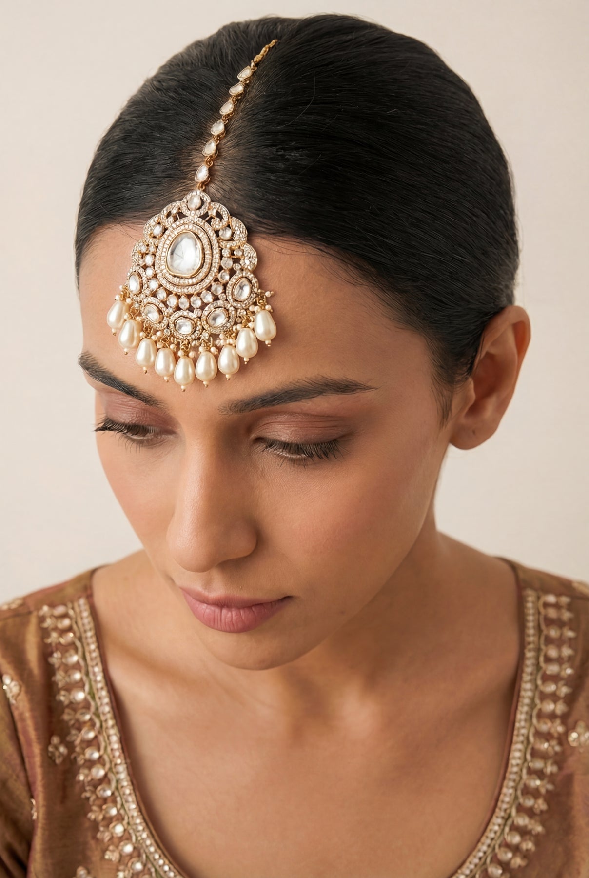 Elevating bridal elegance, this majestic maangtika features a grand teardrop centerpiece surrounded by dazzling kundan polki work. Finished with green bead droplets, it’s a regal statement piece perfect for traditional celebrations.