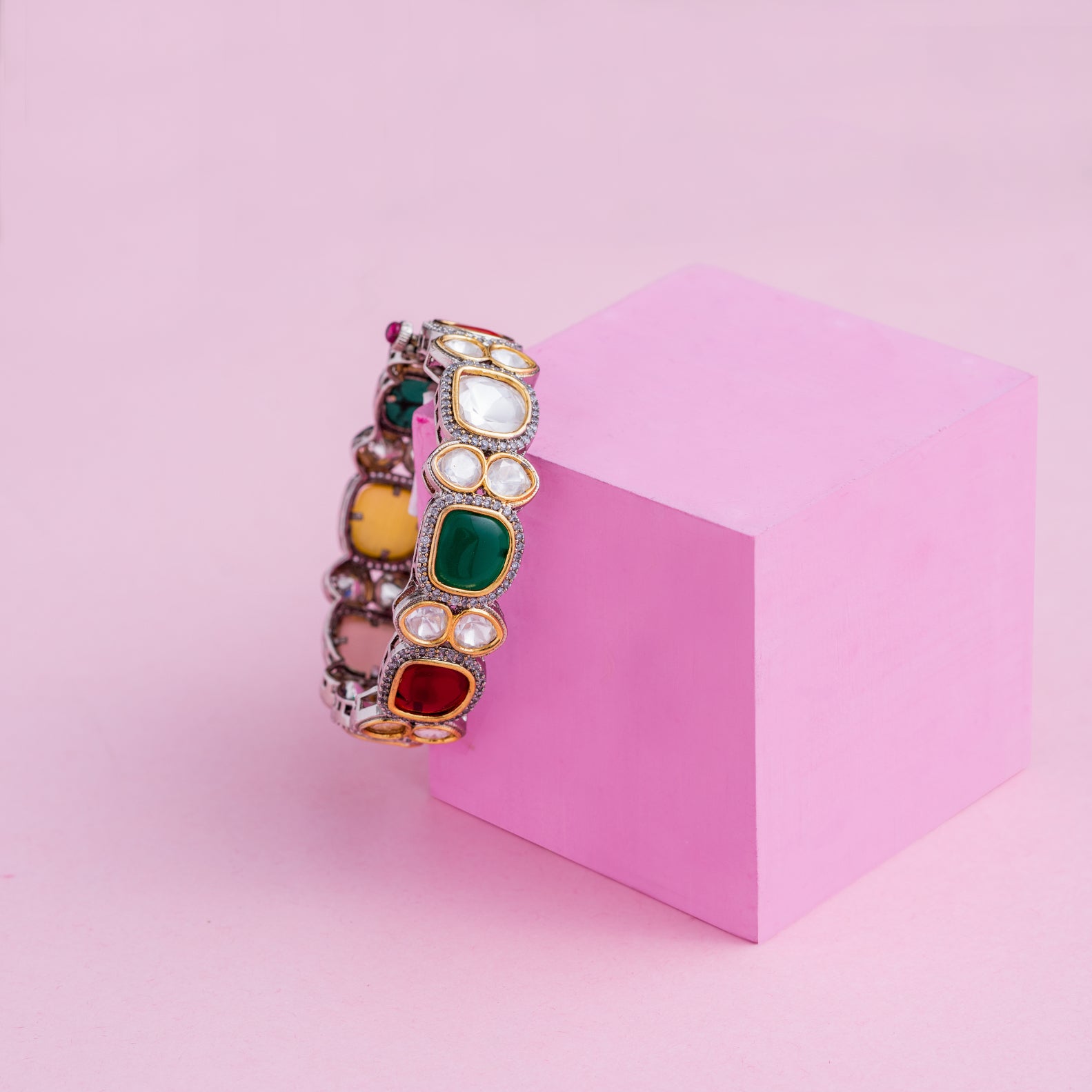 Featuring polki bangle set in a traditional design, showcasing raw elegance with a vintage charm. The silver-toned metalwork is complemented by unique colorful stones, giving them a regal and timeless look. Ideal for weddings or ethnic celebrations. It is sold as a single piece.