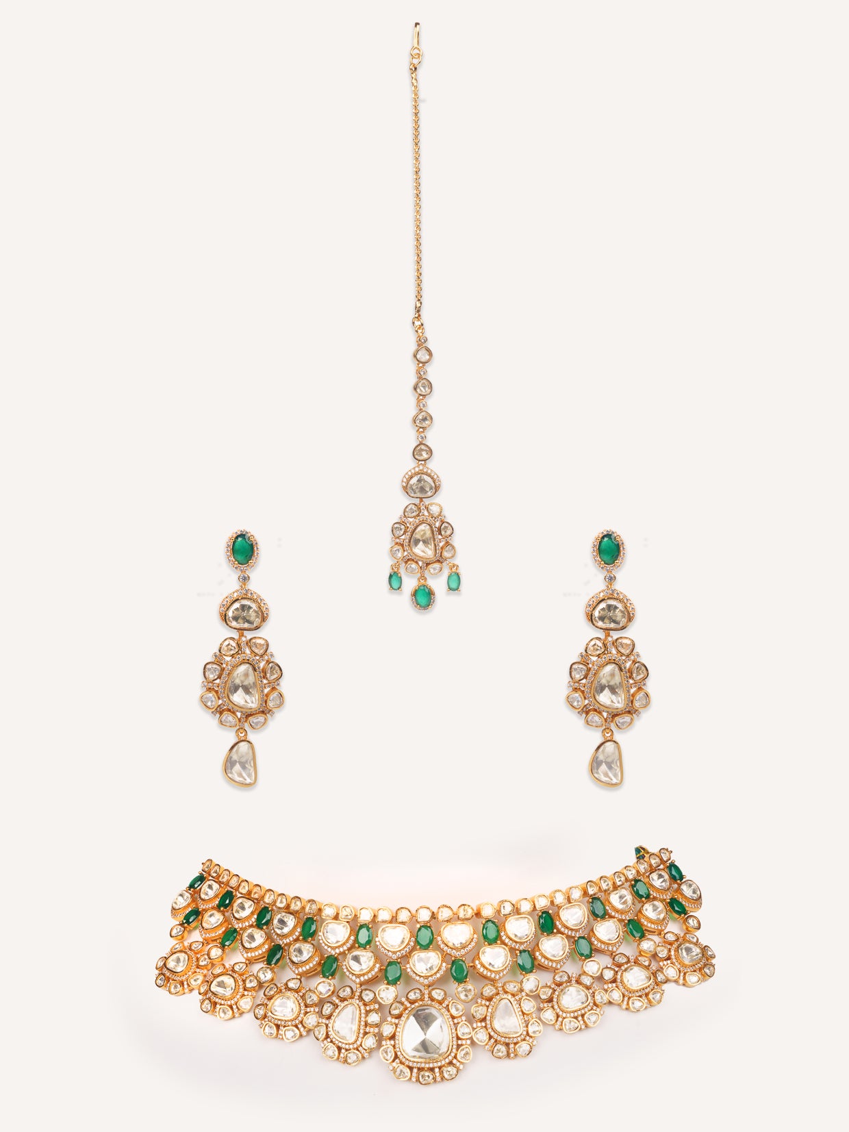 Showcasing moissanite necklace set that showcase timeless elegance with its vibrant green brilliance and sophisticated craftsmanship. It comes with a pair of matching earrings and maangtika. Perfectly balanced between tradition and modern luxury, this set is a stunning statement of refined taste and grace.