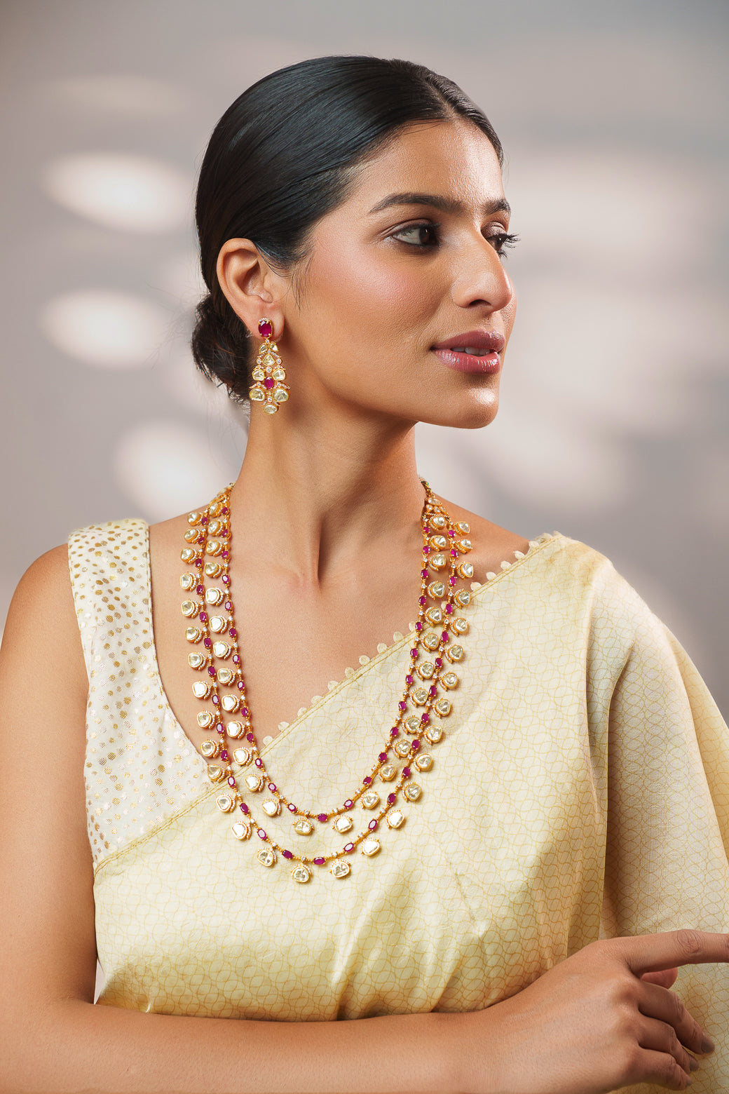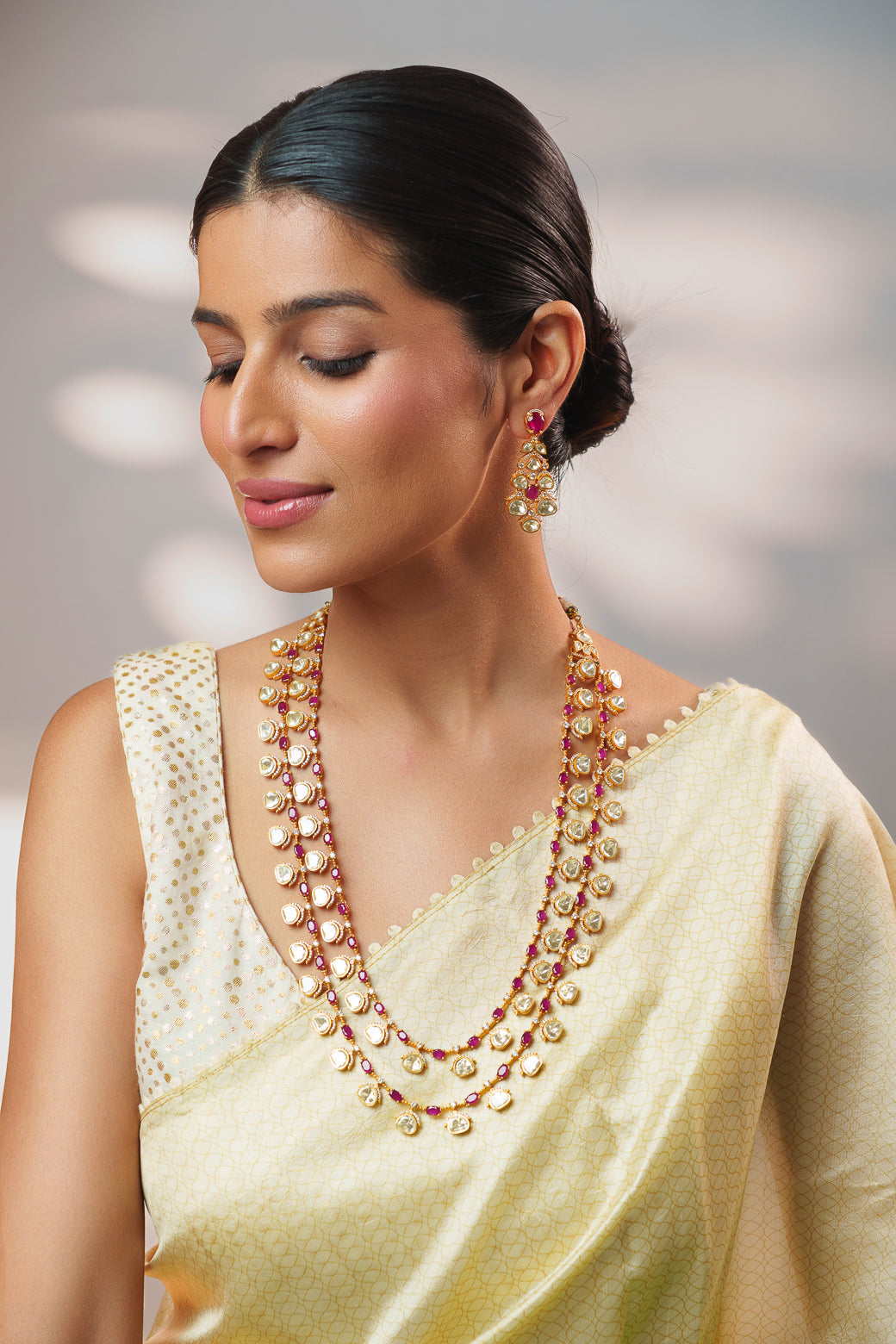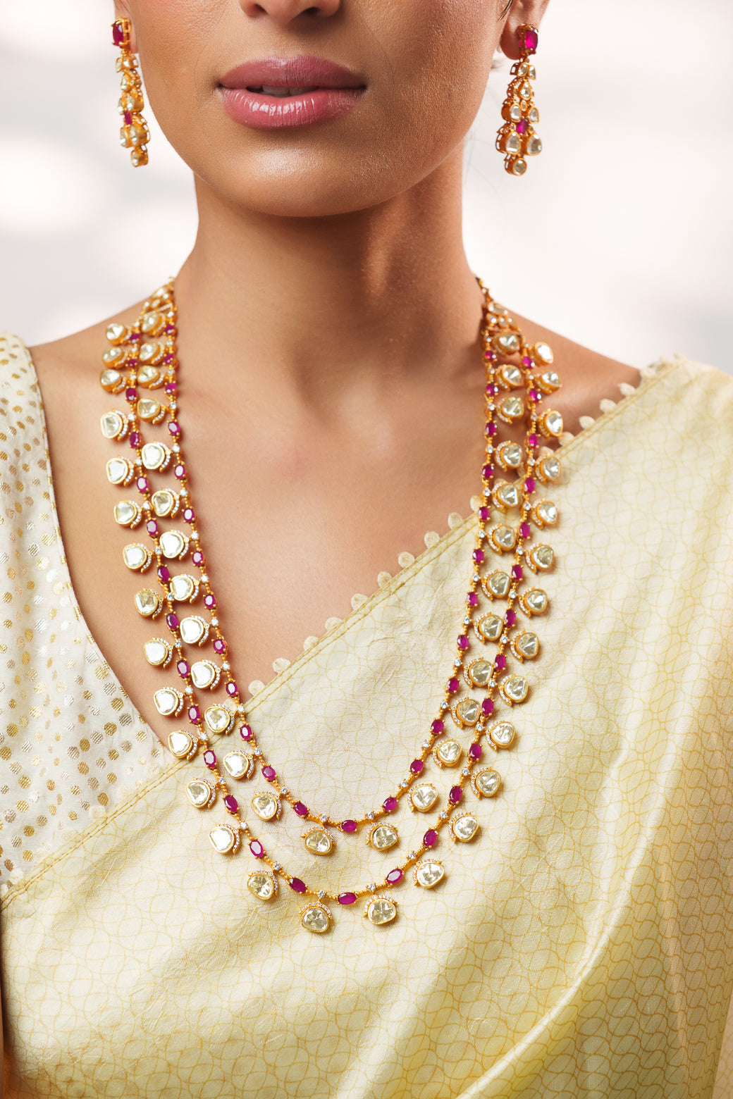 A masterpiece of regal allure, featuring 2 line long necklace set with exquisite moissanite stones and touch of red stones that shimmer with divine brilliance. It comes with a pair of matching earrings. Its graceful, elongated design adds a touch of majesty to any ensemble, making it perfect for grand occasions.