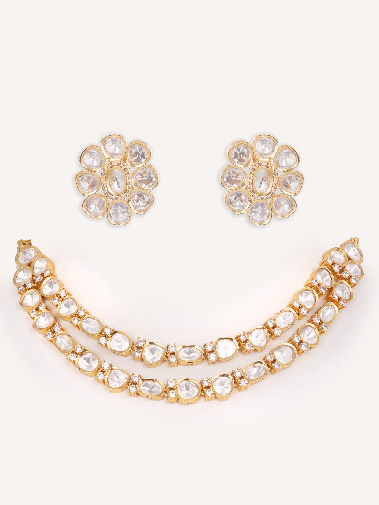 Radiating understated elegance, this kundan necklace set is a timeless beauty. Meticulously crafted with symmetrical uncut stones, it adds a graceful sparkle perfect for both traditional and contemporary ensembles. It is paired with floral studs.