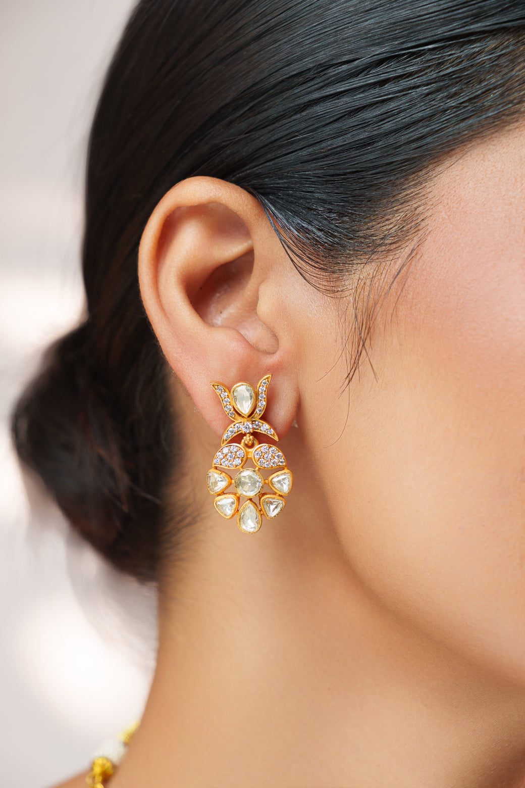 A masterpiece of refined elegance, featuring brilliant moissanite stones set in an intricate, regal design. It comes with a pair of matching earrings. Perfect for grand occasions, it adds a touch of timeless sophistication to any ensemble.