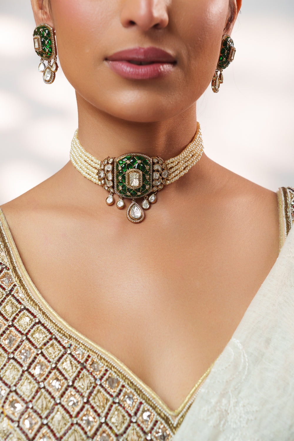 A regal choker adorned with uncut polkis in two tone finish. The touch of green stones adds a refreshing contrast, making it a perfect blend of heritage charm and timeless grace. It comes with a pair of matching earrings. Perfect for every occasion