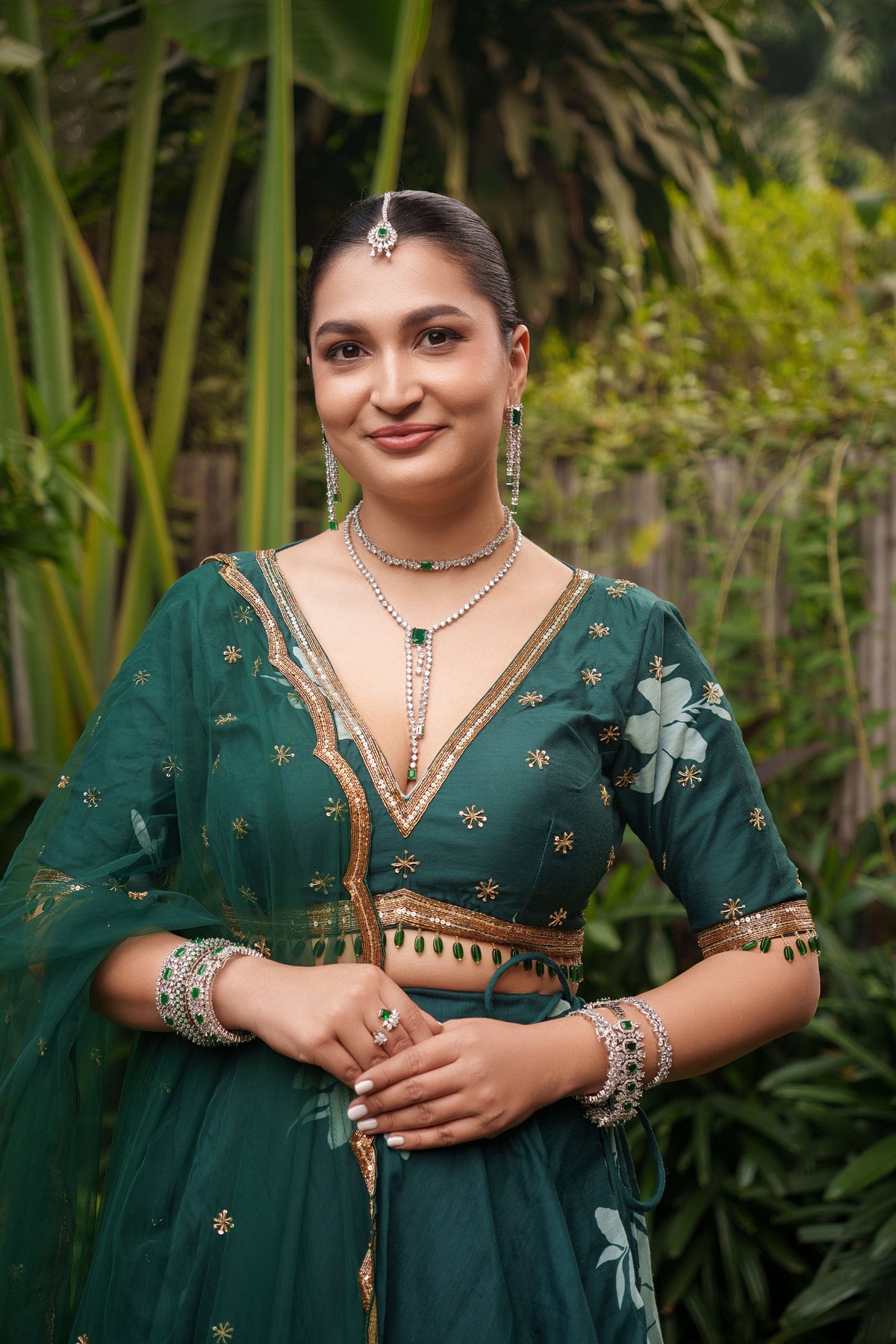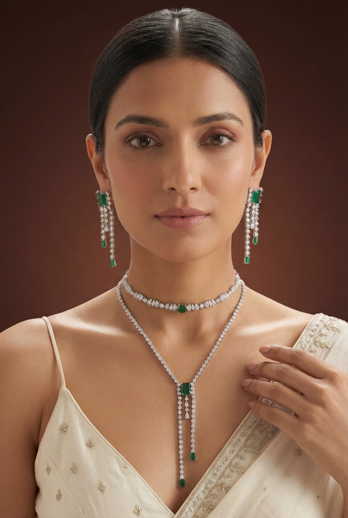 An elegant diamond-style choker and long pendant set, accented with rich emerald-green stones for a timeless appeal. The choker sits delicately at the neckline, while the long pendant adds graceful length and movement. Paired with matching earrings, this set exudes classic sophistication and refined luxury.