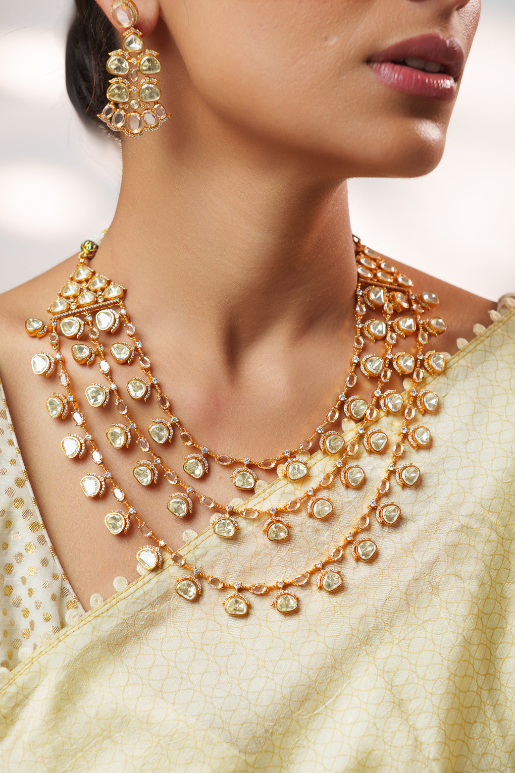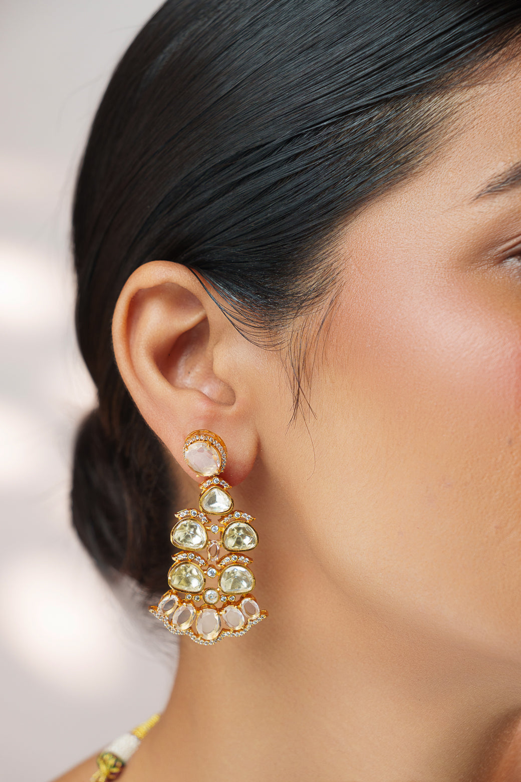 A masterpiece of regal allure, featuring 3 line long set with exquisite moissanite stones that shimmer with divine brilliance. Its graceful, elongated design adds a touch of majesty to any ensemble, making it perfect for grand occasions.