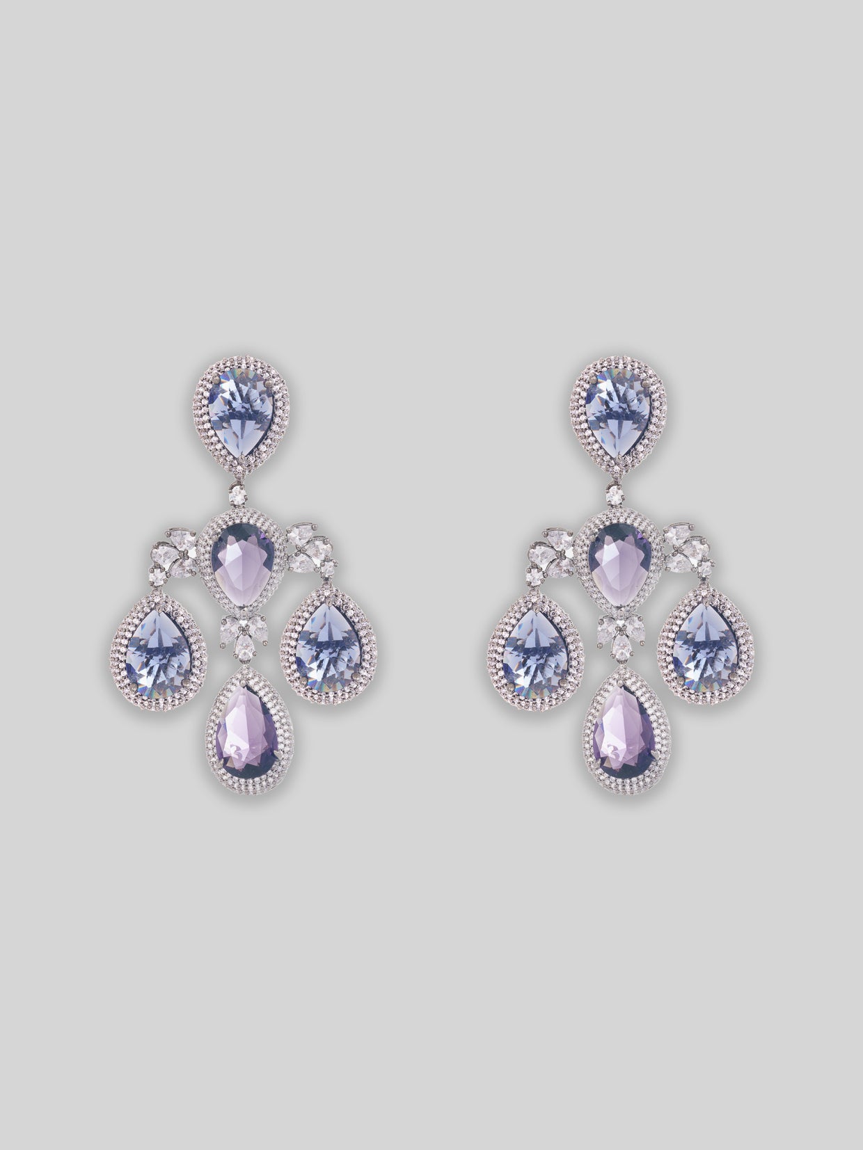 Featuring a pair of rhodium finish diamond statement earrings, set in mixed metal. These earrings are embellished with hanging teardrop purple stones, adding elegance and movement to the luxurious piece.