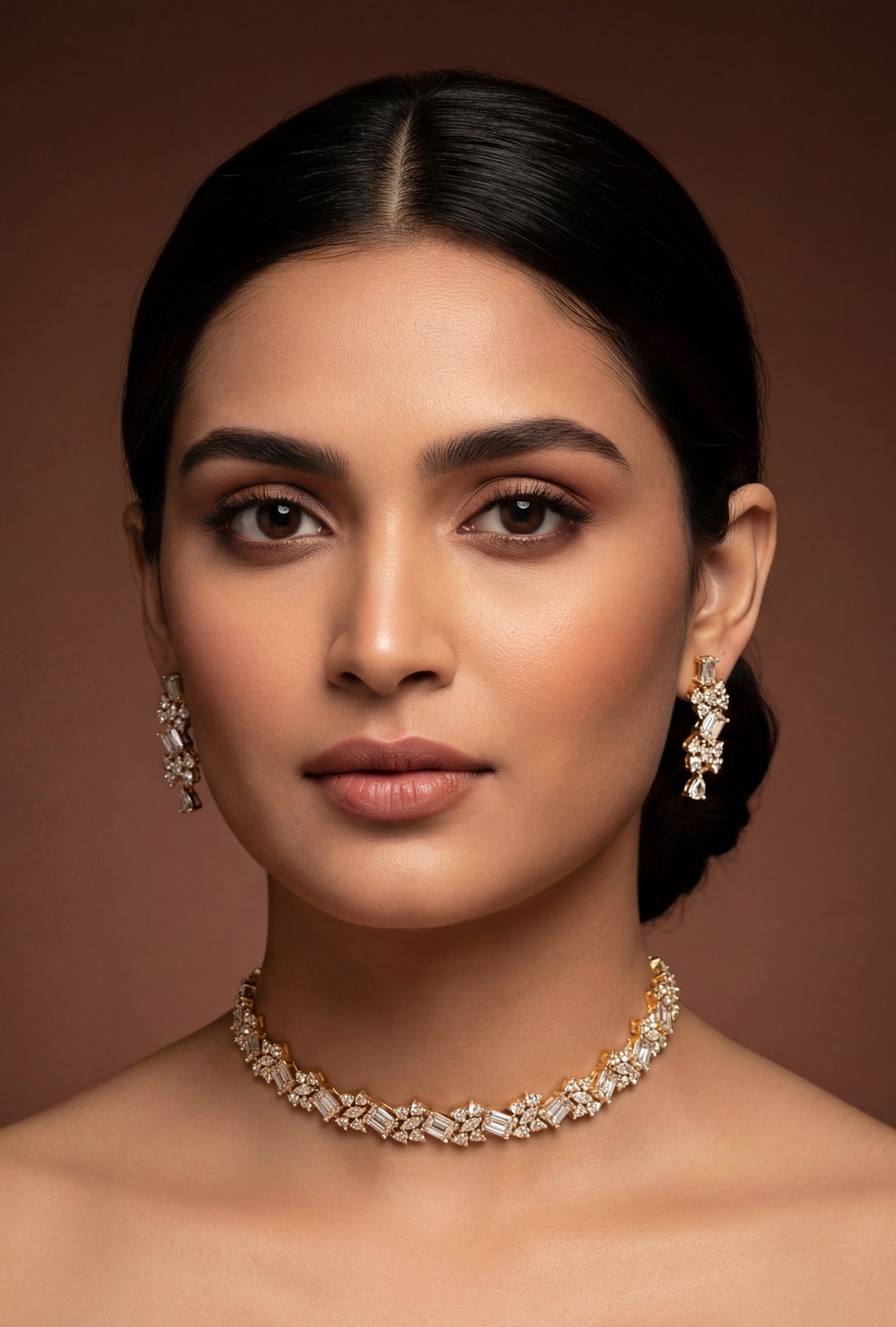 A harmonious blend of elegance and intricacy, this diamond necklace set dazzles with its delicate diamonds and impeccable craftsmanship. It comes with a pair of matching earrings. Perfect for making a refined statement at any special occasion.