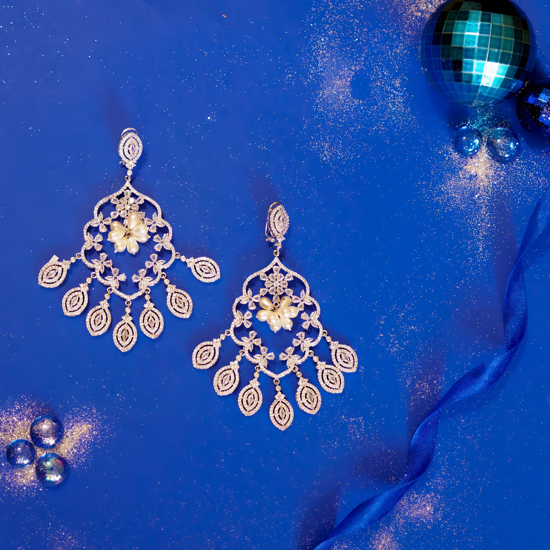 Blending regal charm with refined elegance, these statement diamond earrings feature luminous pearls in diamond setting. These earrings make a stunning statement of grace and grandeur for any sophisticated occasion.