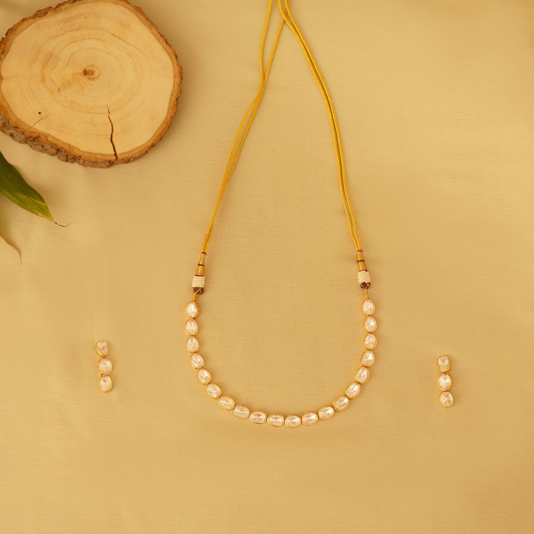 A graceful celebration of heritage, this necklace set is adorned with classic kundan work and delicate gold detailing. Its refined elegance makes it an exquisite choice for weddings and festive occasions.