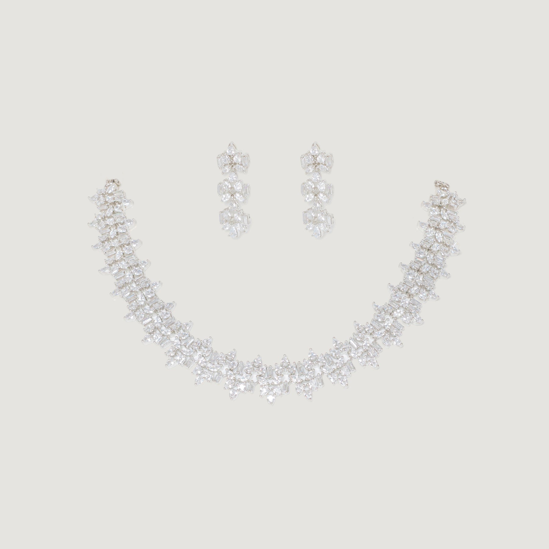 A harmonious blend of elegance and intricacy, this diamond necklace set dazzles with its delicate diamonds and impeccable craftsmanship. It comes with a pair of matching earrings. Perfect for making a refined statement at any special occasion.