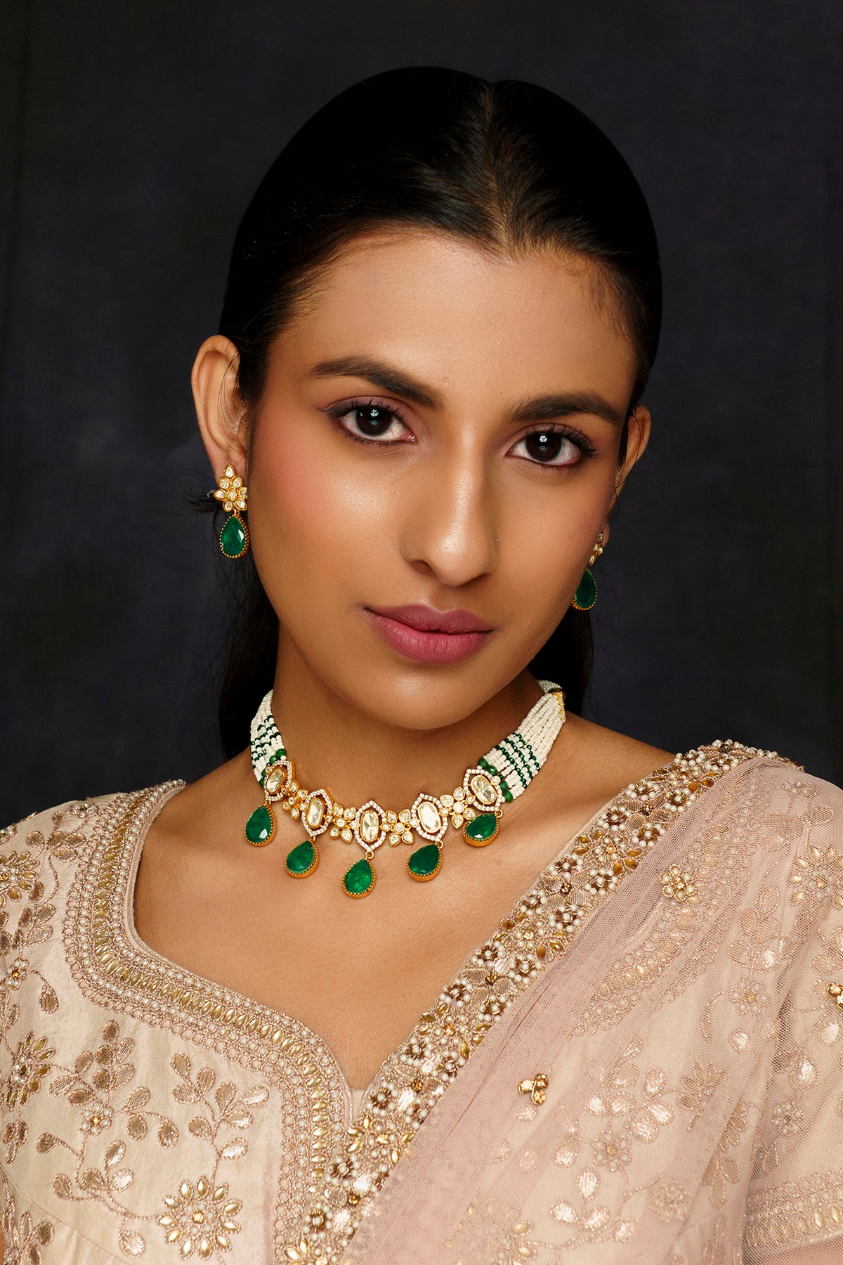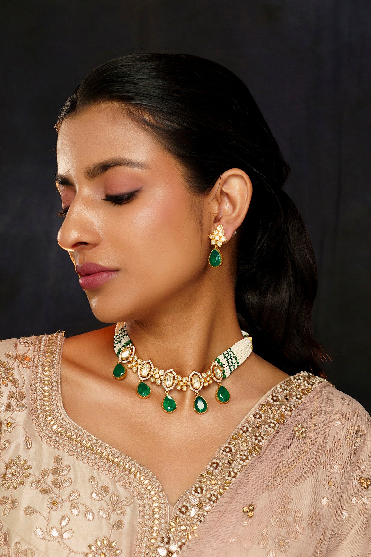 An elegant choker dazzling with rich green drops, radiant moissanite stones, and layered pearl strands. A luxurious blend of heritage and sophistication, it’s perfect for elevating any festive or bridal ensemble.