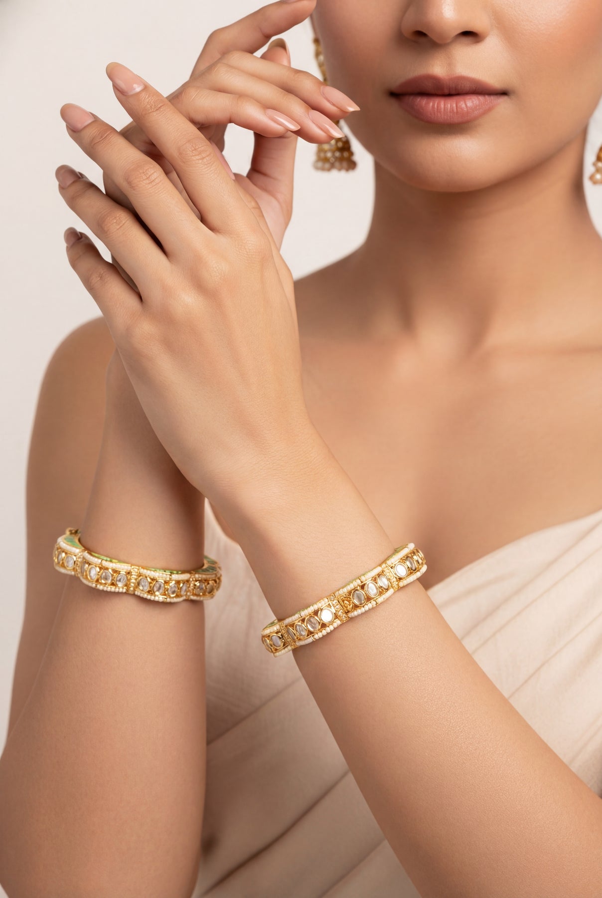 Exquisite pair of kundan bangles featuring a scalloped edge design adorned with vibrant mint green enamel and lustrous white pearls. The rich contrast and detailed craftsmanship make them a stunning accessory for festive and traditional wear.