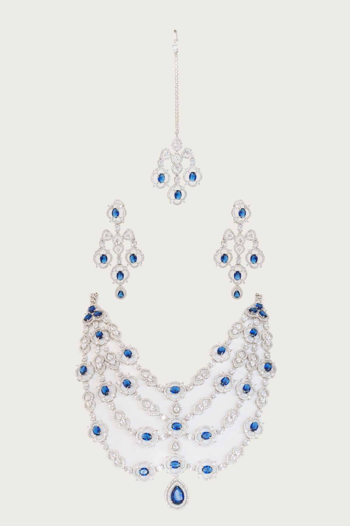 Featuring a white finish exquisite diamond long layered necklace with sapphires. It comes with a pair of matching earrings and maangtikka. Perfect to make a statement at any occasion.
