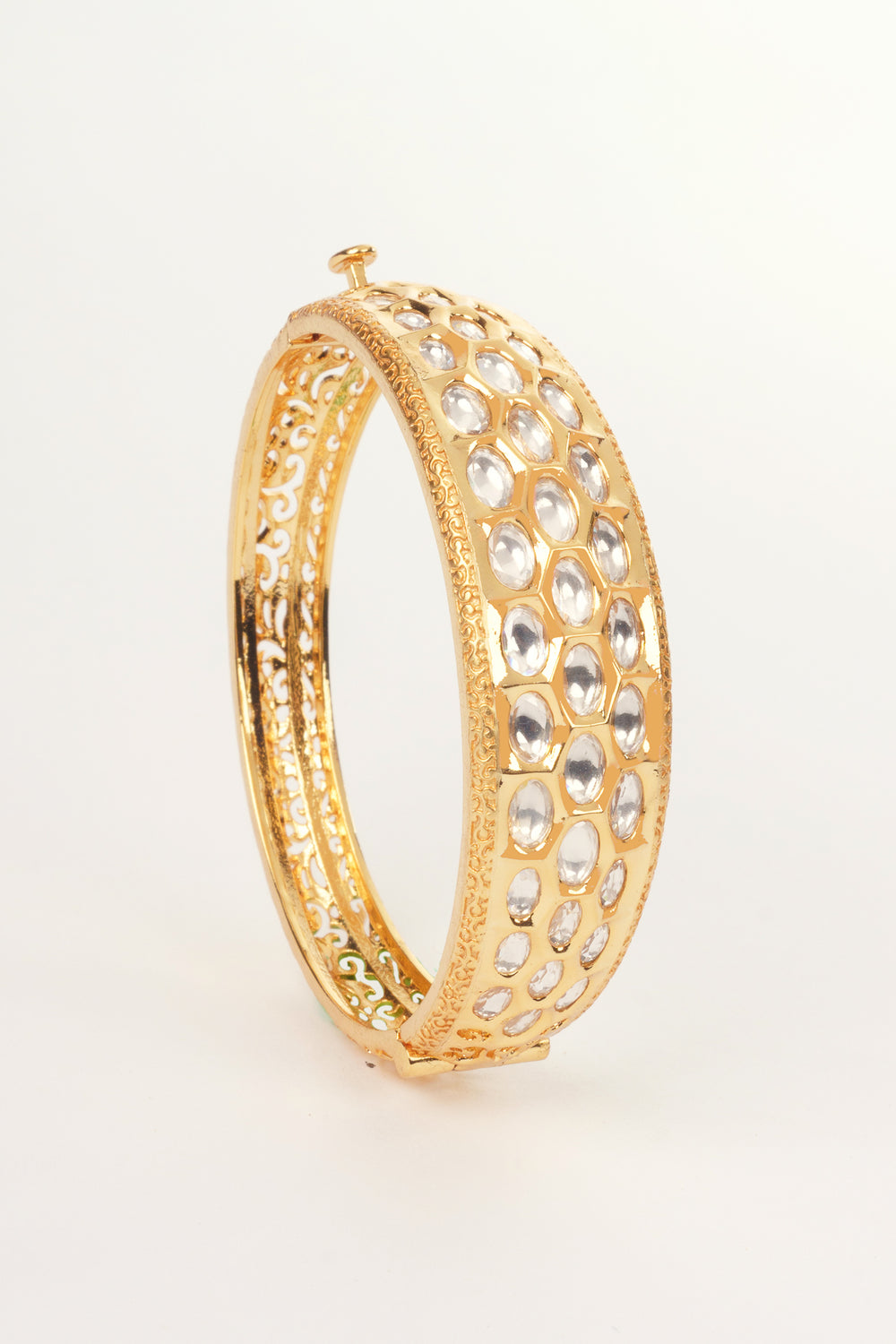 Elegant openable bangle featuring a graceful arrangement of kundan stones in gold finish. Adding a touch of artisanal charm, it is ideal for weddings and grand celebrations.